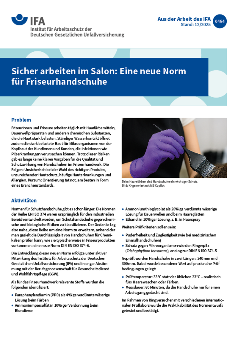 Die Informationsblätter "Aus der Arbeit des IFA" und "Aus der Arbeit der DGUV Akademie" stellen ausgewählte Aktivitäten der beiden Einrichtungen kurz und übersichtlich dar. Sie geben auch Hinweise auf weiterführende Literatur und Ansprechpersonen.