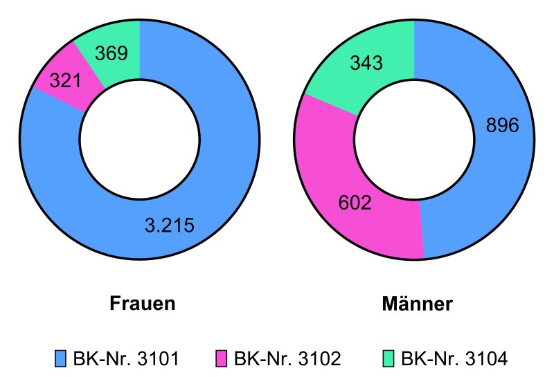 Insgesamt wurden im Untersuchungszeitraum 5.746 Fälle als Berufskrankheit anerkannt. Das entspricht 5,9 Prozent aller anerkannten Berufskrankheiten in dem betrachteten Zeitraum (ohne Covid-19). Es wurde kein Fall der BK-Nr. 3103 verzeichnet. In Abbildung 1 sind die entsprechenden Verteilungen der DGUV-Daten nach Geschlecht aufgeführt. Bei Frauen entfielen 78 Prozent der anerkannten Fälle auf die BK-Nr. 3101, bei Männern waren es 65 Prozent. Die zweithäufigste anerkannte Infektionskrankheit bei Männern ist die BK-Nr. 3102, deren Anerkennungen nahezu doppelt so häufig auftraten wie bei der BK-Nr. 3104. Bei den Frauen hingegen kommen diese beiden Berufskrankheiten fast gleich häufig vor. In der SVLFG wurde kein Fall der BK-Nr. 3104 und nur ein Fall der BK-Nr. 3101 verzeichnet. Alle anderen Anerkennungen entfielen auf die BK-Nr. 3102. Hierbei betrug der Anteil bei den Männern 74 Prozent.